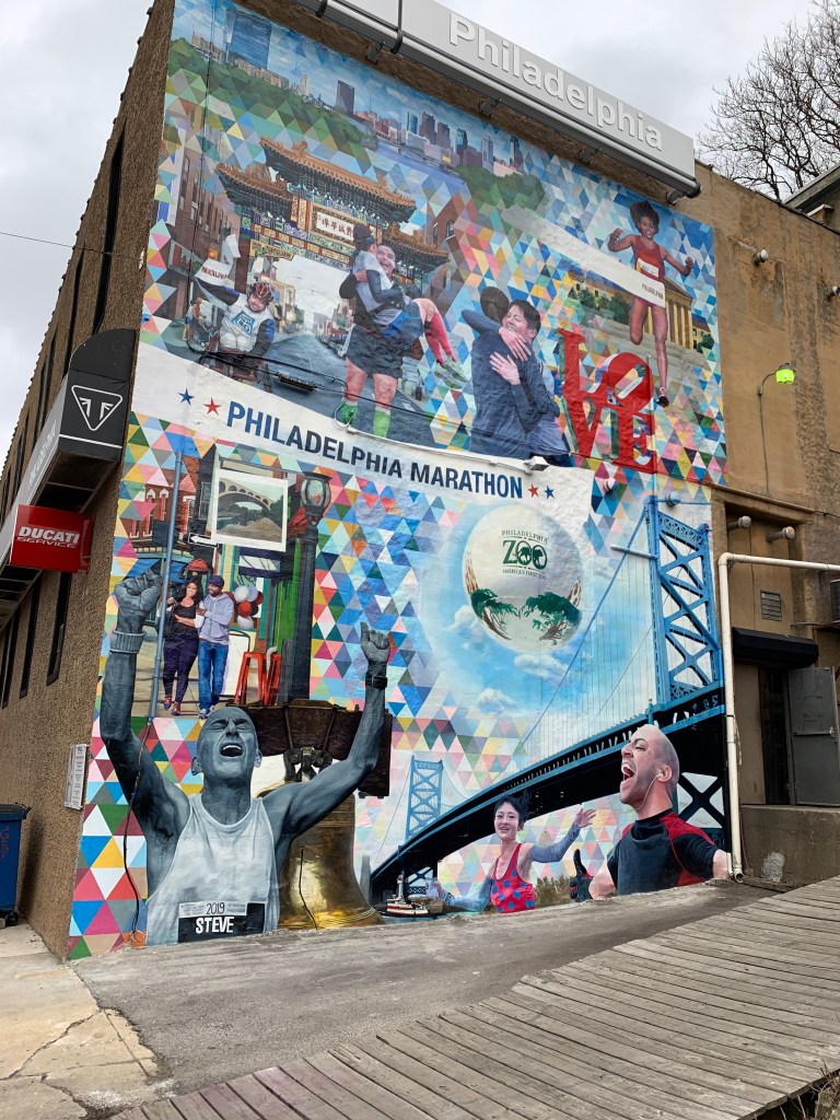 The second Mural I went to see was abbot the Philadelphia Marathon. The Philadelphia Marathon Mural was created to celebrate the history of the Philadelphia Marathon. The extremely famous race that has attracted thousands of runners to the city every year since 1994. It is located along the race route, the mural features sights from throughout the course and expresses the diversity of racers who participate each year. Many famous Philadelphia land market are featured like China Town, the Rocky Steps, and the Benjamin Franklin Bridge.