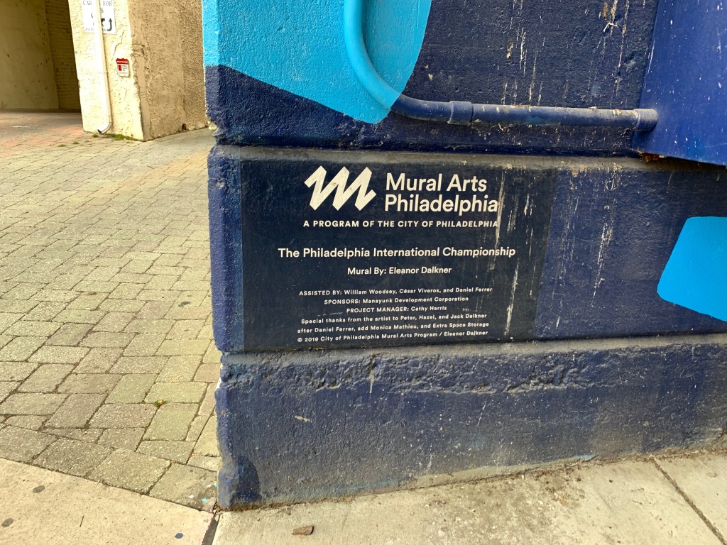 The fourth mural I looked at was the mural for the The Philadelphia international championship. The site that was chosen is at the end of Main Street in Manayunk, under a rail trestle at Leverington Avenue. The location was chosen due to the it being a popular spot for cyclists leaving the city area to bike up Umbria street. It is designed to be a welcome sign to let cyclists know to turn on level roads back into Manayunck. The path at one point was the U.S. National Championship race, it featured a men’s and women’s pro race. To honor of those races the mural is titled The Philadelphia International Championship.