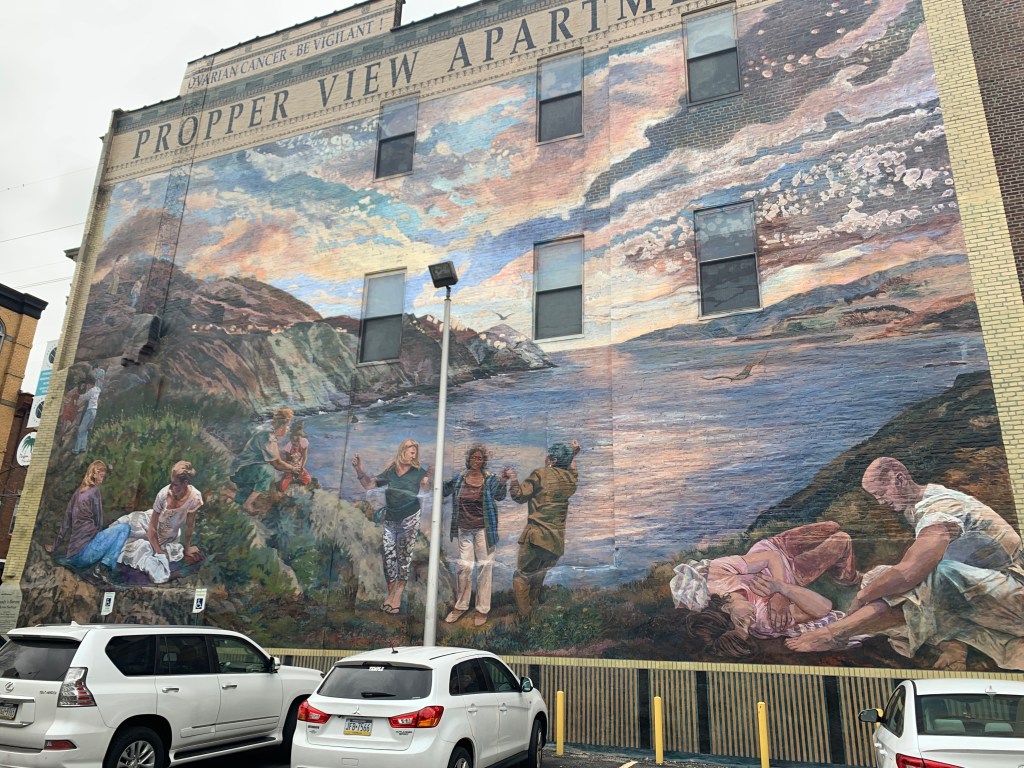 The fifth mural I looked at was Sandy’s Dream. The 69 x 50’ mural was the first wall painting work to raise cancer awareness in the United States. Created in collaboration with members of the Sandy Rollman Foundation, Mural Arts Philadelphia and others. In 2005 the Sandy Rollman Ovarian Cancer Foundation, Mural Arts Philadelphia and others, came together to create a mural offering awareness and support to those afflicted with Ovarian Cancer. In 2014 the mural was restored and had a ceremony. The ceremony was marked by a moment of silence in memory of all women lost and in honor of all women still fighting. Also many Manayunk businesses came together to donate a portion of their proceeds toward the Sandy Rollman Ovarian Cancer Foundation.